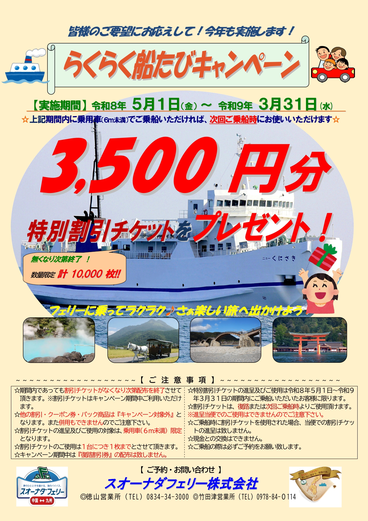 ○特別割引チケットの進呈及びご使用は、令和8年5月1日〜令和9年3月31日 の期間中にご乗船頂いたお客様に限ります。